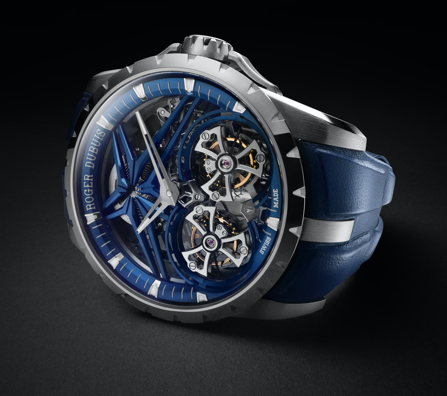 A boutique-only release and limited to 28 pieces, the Roger Dubuis Excalibur Double Tourbillon Cobart Chrome comes on a blue calf strap with a titanium folding buckle that has the brand’s Quick Release System for strap changes.