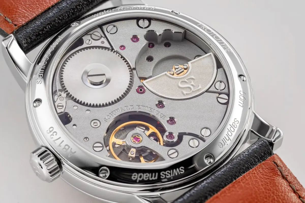 Powering it is the same automatic Schwarz Etienne ASE 200.02. Beating at 21,600 VPH, it has a power reserve of 86 hours. The mainplate is sand-blasted grey brass and the bridges also have grey PVD-treatment and are sand-blasted. There are rhodium-plated angles and the Schwarz Etienne logo appears on the micro-rotor.