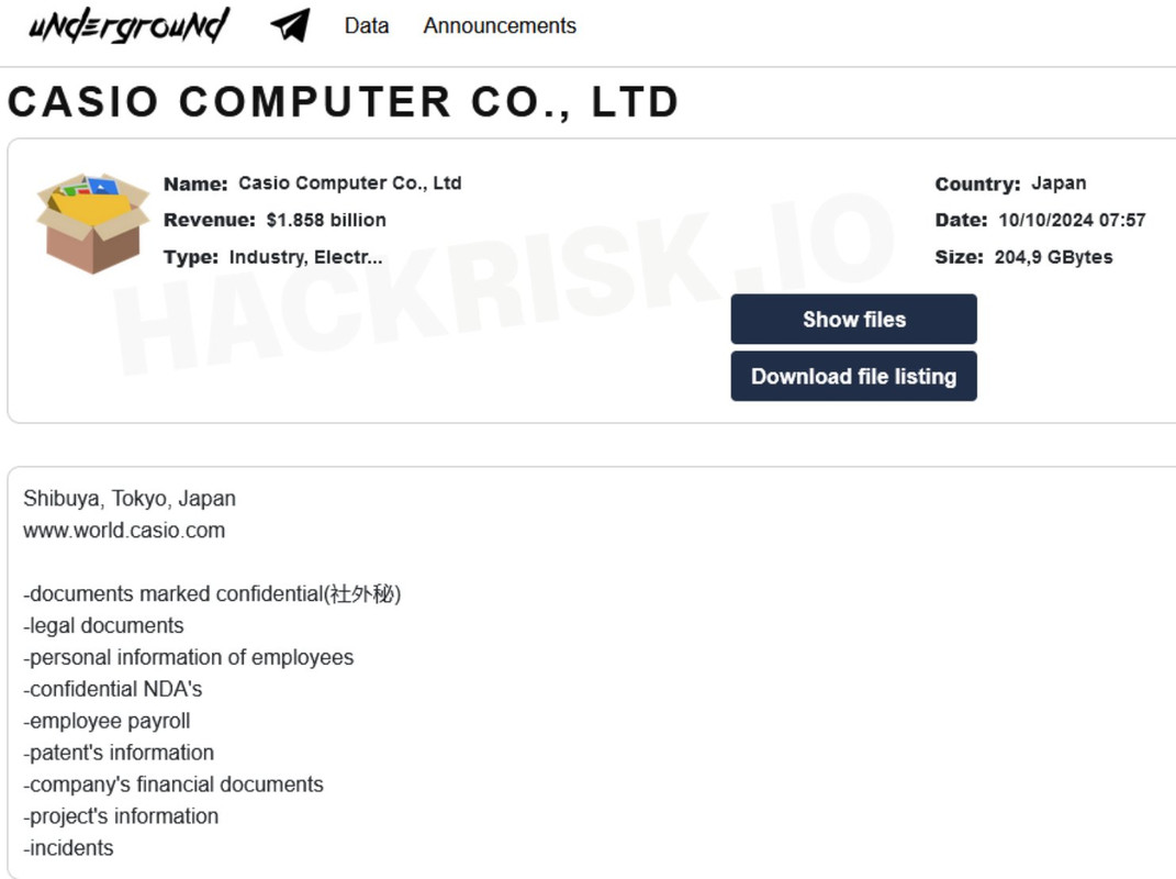 Casio has confirmed that the cyber-attack was a ransomware one conducted by the group Underground, which has taken credit and claims that 204.9 GB of data were exfiltrated. The information obtained includes confidential company information, information from business partners, employee files, patents, financial documents, legal document, project information, job applicant data, NDAs, and even some customer information.