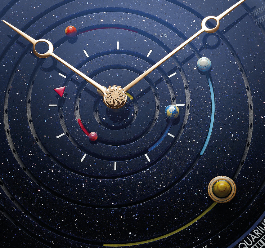 The only mechanical planetarium watch displaying all eight planets, showing real time orbits of Mercury, Venus, Earth, Mars, Jupiter, Saturn, Uranus and Neptune around the Sun. The Sun is in the middle, with planets following eccentric paths to mirror their actual paths as accurately as one can achieve in a wristwatch form.