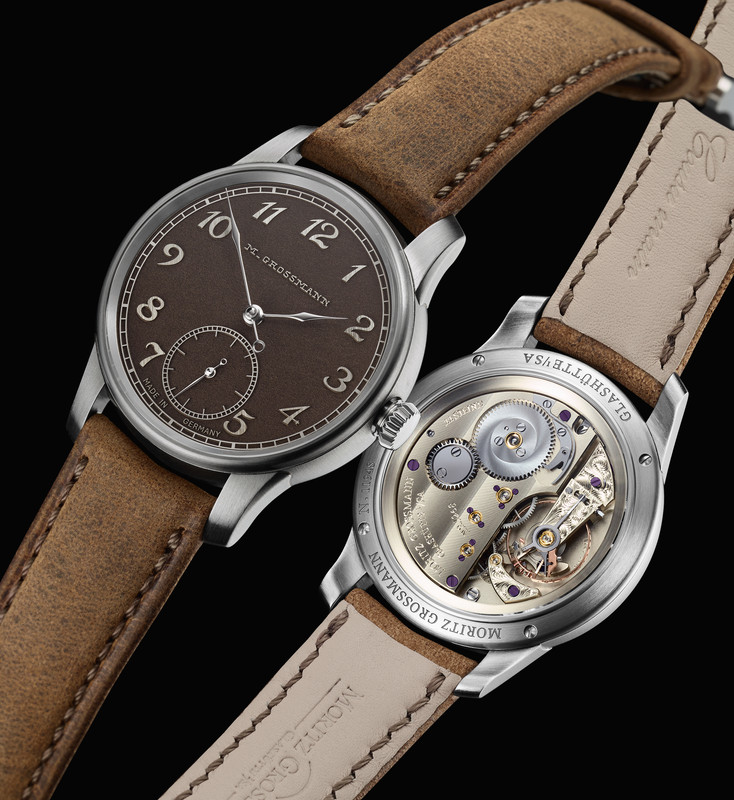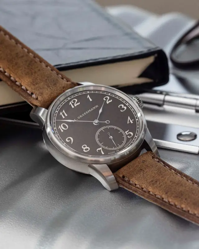 The hand-polished hands are accompanied by raised Arabic numerals that have brushed finishing, as does the minute scale and the historic 1875 Grossmann logo.