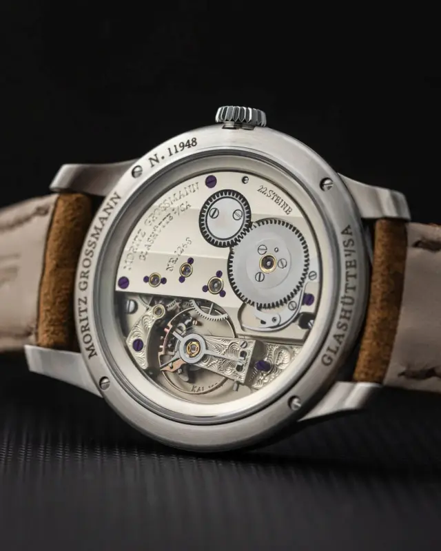 Through the open case back can be seen the manually-wound Moritz Grossmann in-house 102.1. A pillar movement featuring a 3/5 plate with frame parts in untreated German silver, it has a removable clutch winder, raised gold chatons with pan-head screws almong with a modified regulator. The movement also features some classic Mortiz Grossmann features such as a shock-resistant proprietary escapement with 18-tooth escape wheel. Beating at 21,600 VPH with a power reserve of 48 hours, its finishing includes hand engraving on the balance cock.