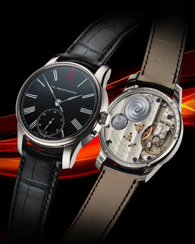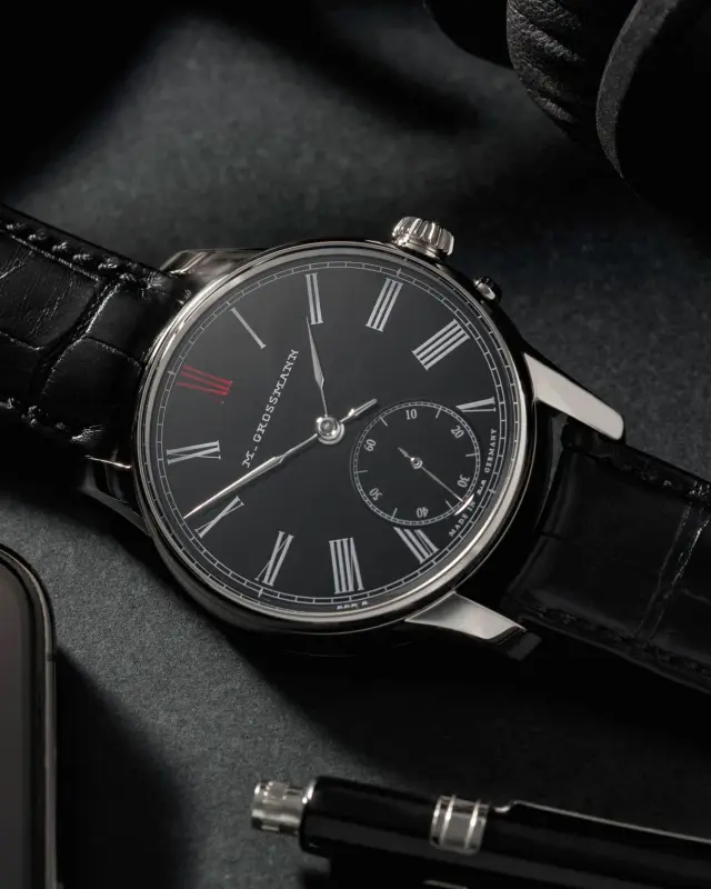 These dials have traditionally been white enamel with either Roman or Arabic numerals, even in their modern form, but this new model’s black enamel dial with Roman numerals in white and the twelve XII in red puts it firmly in this century. Another positional (both within the brand and overall is the use of the historic ‘M.Grossmann’ logo, which is also enamel. It is applied through pad printing before the firing process. The hands for both the main dial and the seconds sub dial (which has a stop seconds) are polished steel.