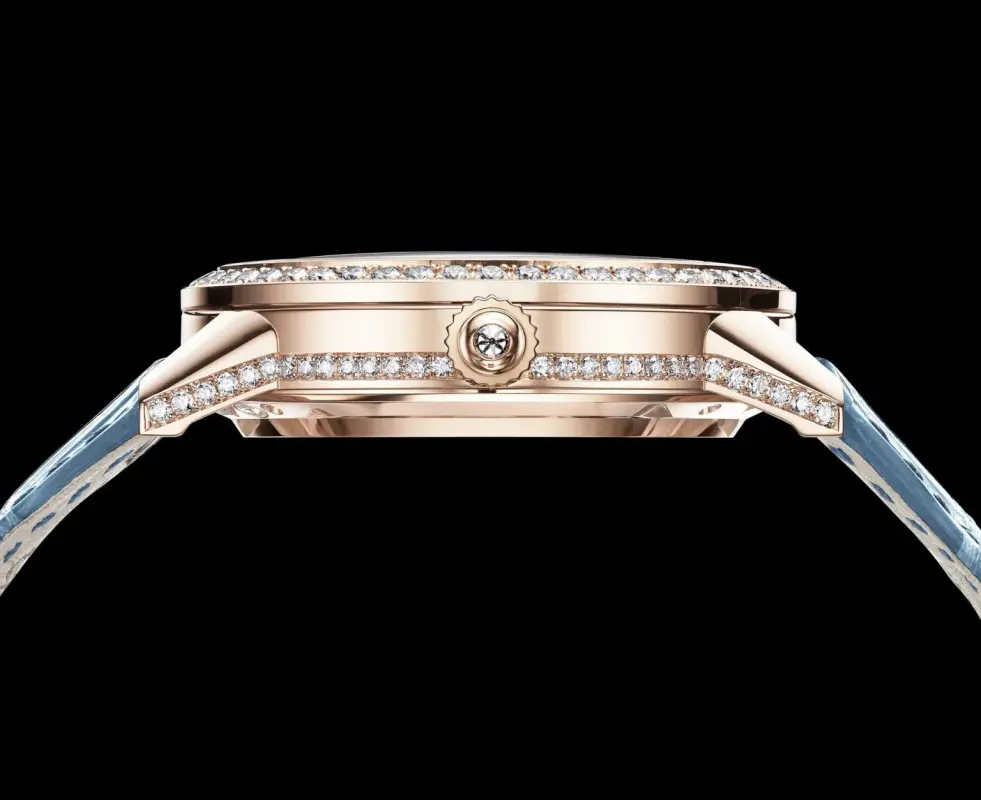 Featuring a dial in a blue-green colour that made its inaugural appearance last year, the 39mm sized 18k pink gold case is diamond-set. In total, the Rendez-Vous Jewellery Tourbillon has 215 diamonds (2.52 carats), including a brilliant-cut diamond in the crown.