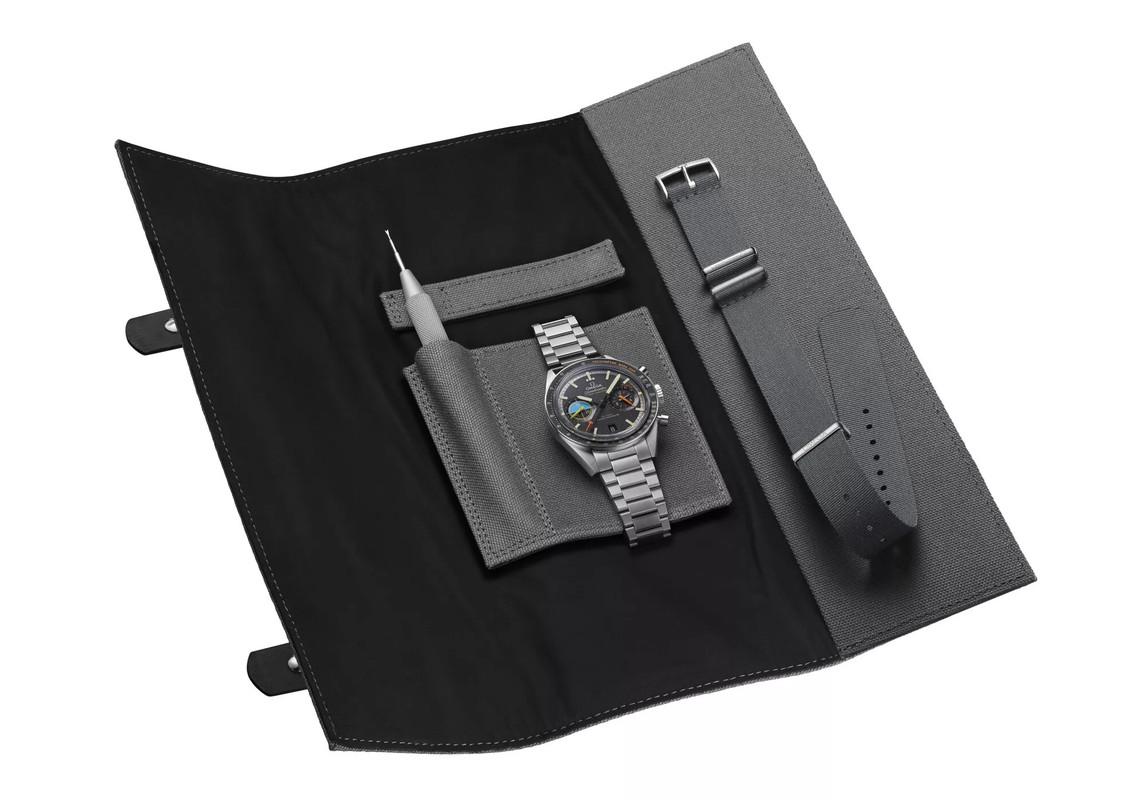 The new Speedmaster Pilot chronograph comes on a stainless steel bracelet with the brand’s patented comfort release adjustment system. You also get a grey NATO strap with KEVLAR® threads and a brushed stainless steel buckle. A travel pouch is also included.