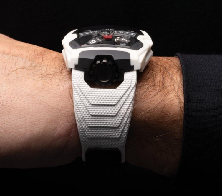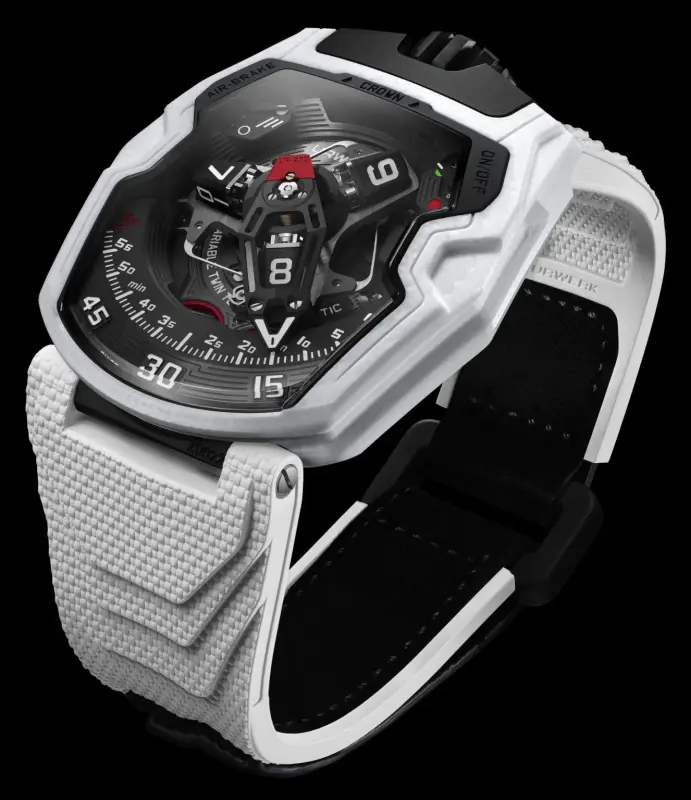 Now, URWERK has brought a new member to the UR-230 collection family in the form of the UR-230 Polaris, which has a white case machine-carved from a block of proprietary ceramic composite consisting of layered sheets of woven ceramic and fibreglass. The resin that covers the sheets is coloured white, and the fibre glass is light silver.