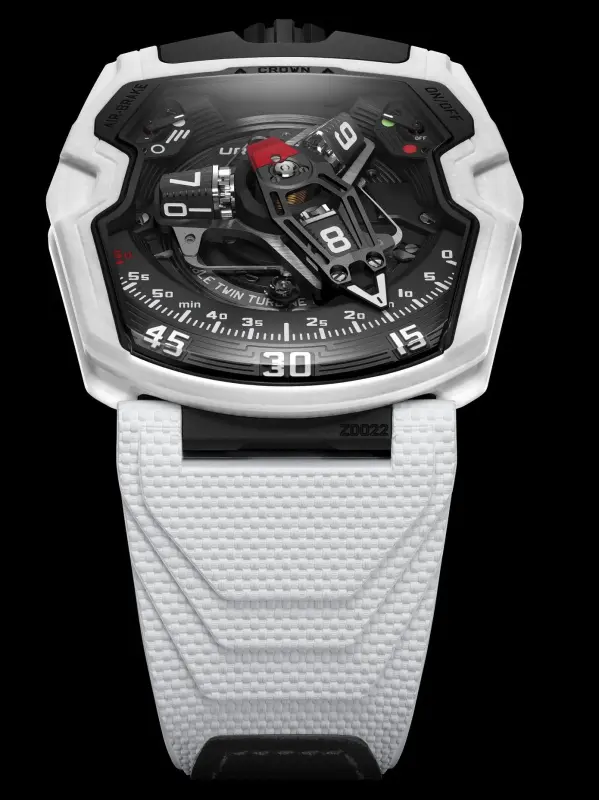 It also featured a newly developed set of shock absorbers designed to protect the new Calibre UR-7.30 via a set of turbines whose task is to reduce the impact of external shocks, and a second set of turbines controlling the air (which they call an ‘air brake’) that feeds through the winding system, modulating the winding powder according to wrist activity and set via a rotating knob at the rear of the watch.