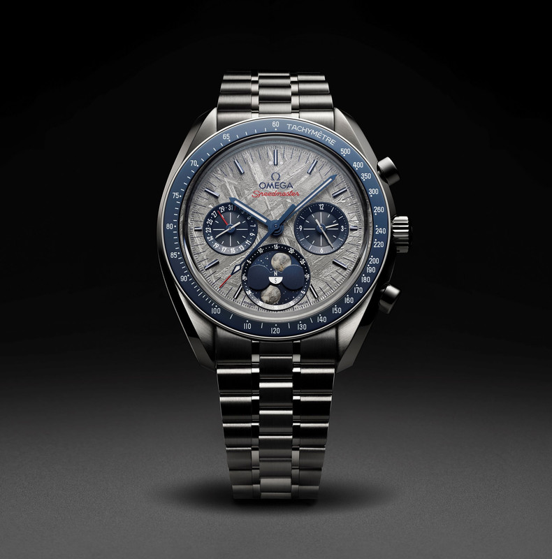 As in the name indicates, the Speedmaster Moonphase Meteorite models feature dials with Widmanstätten-patterned meteorite. This type of meteorite dial has become familiar, but there’s an additional layer of familiarity here – remember the Bulova Lunar Pilot Meteorite Chronograph?