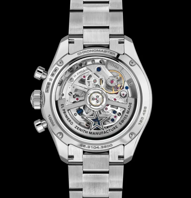 Powered by the automatic El Primero 3600 high-frequency chronograph movement with 1/10th of a second chronograph function, it beats at 36,000 VPH and has a power reserve of 60 hours. The oscillating weight has a skeletonised Zenith star.