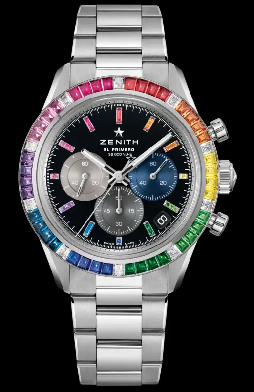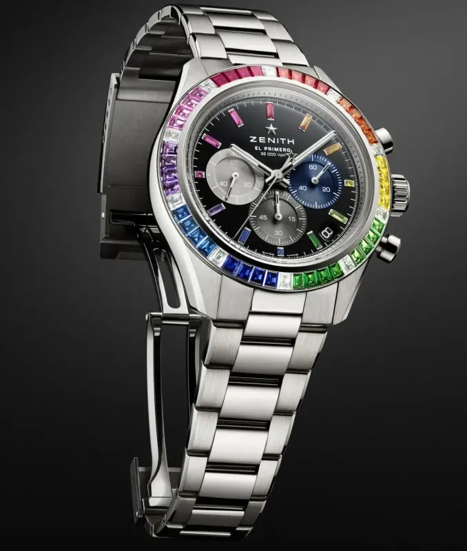 Zenith’s new Chronomaster Sport Rainbow is the first model within the collection to have a white gold case and bracelet. Made of solid 18k white gold with baguette-cut white diamonds and rainbow sapphires on the bezel, it is not the first variant of this model to have precious stones on the bezel since the model’s launch in 2021, but it’s the most colourful.