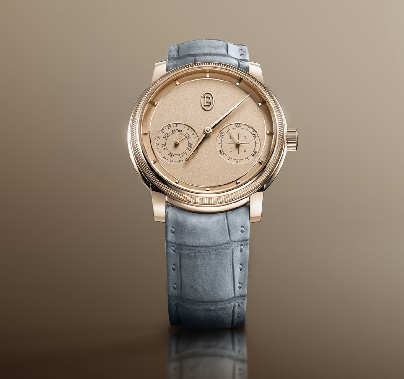 Powering the new Toric Quantieme Perpétuel is the manually-wound PF733. Beating at 28,800VPH with a power reserve of 60 hours, its 18k rose gold surfaces have the brand’s Côtes de Fleurier pattern, and a sand-blasted mainplate.
