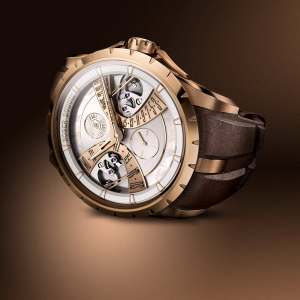The Roger Dubuis Excalibur Biretrograde Calendar comes on a brown calf strap with a pink gold pin buckle and has an RRP of CHF 50,000.