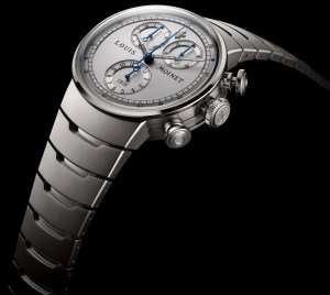The slightly curved rhodiumed dial of the 1816 is mounted with four blued-steel screws and has the same layout, both as per the original for which this pays homage – two saint-brushed totaliser sub dials alongside a small seconds at 6 o’clock – a 12-hour counter and a (jumping) 30-minute counter, situated horizontally on the top half of the dial on either side of the stationary central chronograph hand. The counters have a satin-brushed ring and bead-blasted centre