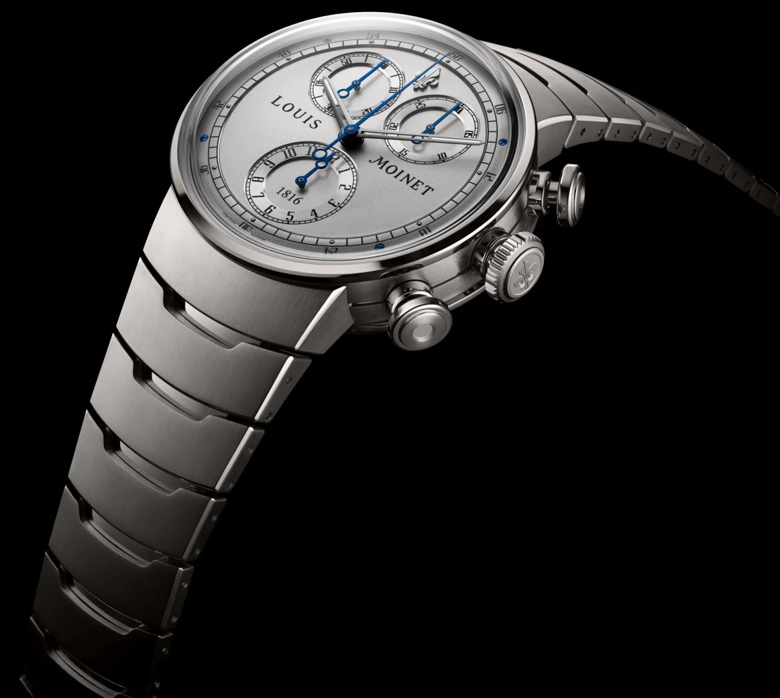 Unexpectedly, it comes on an integrated grade 5 titanium bracelet. The brand’s first metal bracelet, it features a mix of satin and polished finishing. The new Louis Moinet 1816 Chronograph has an Australian RRP of $52,000.