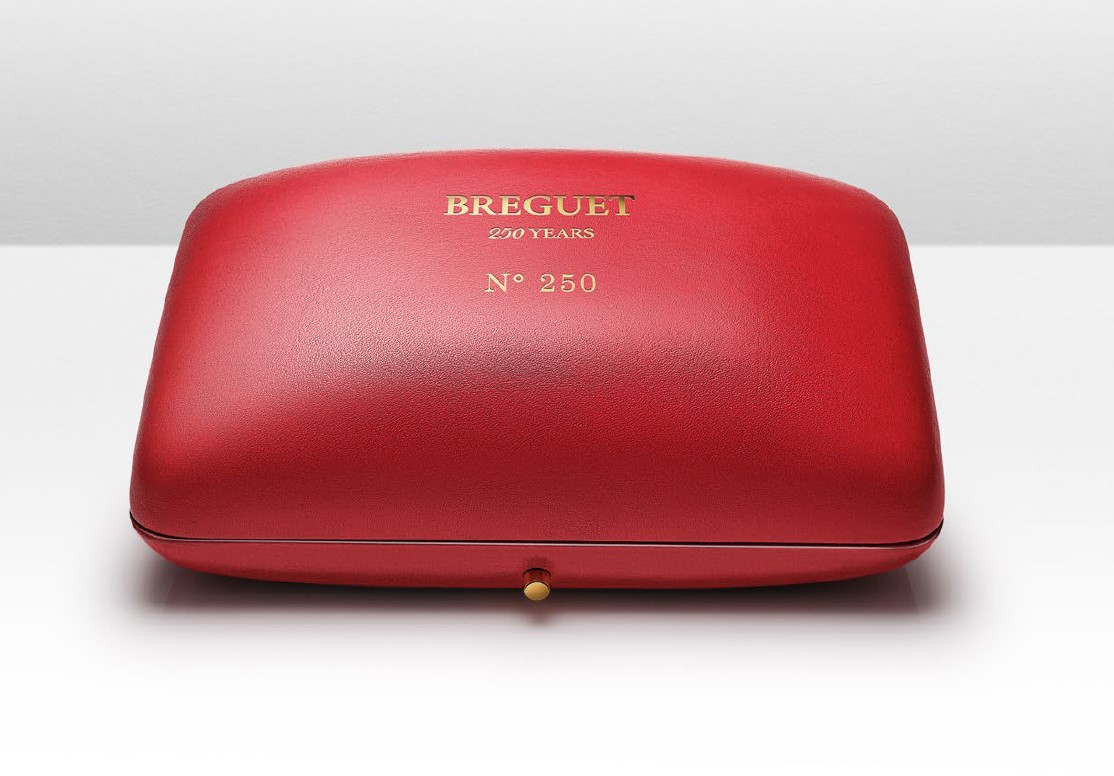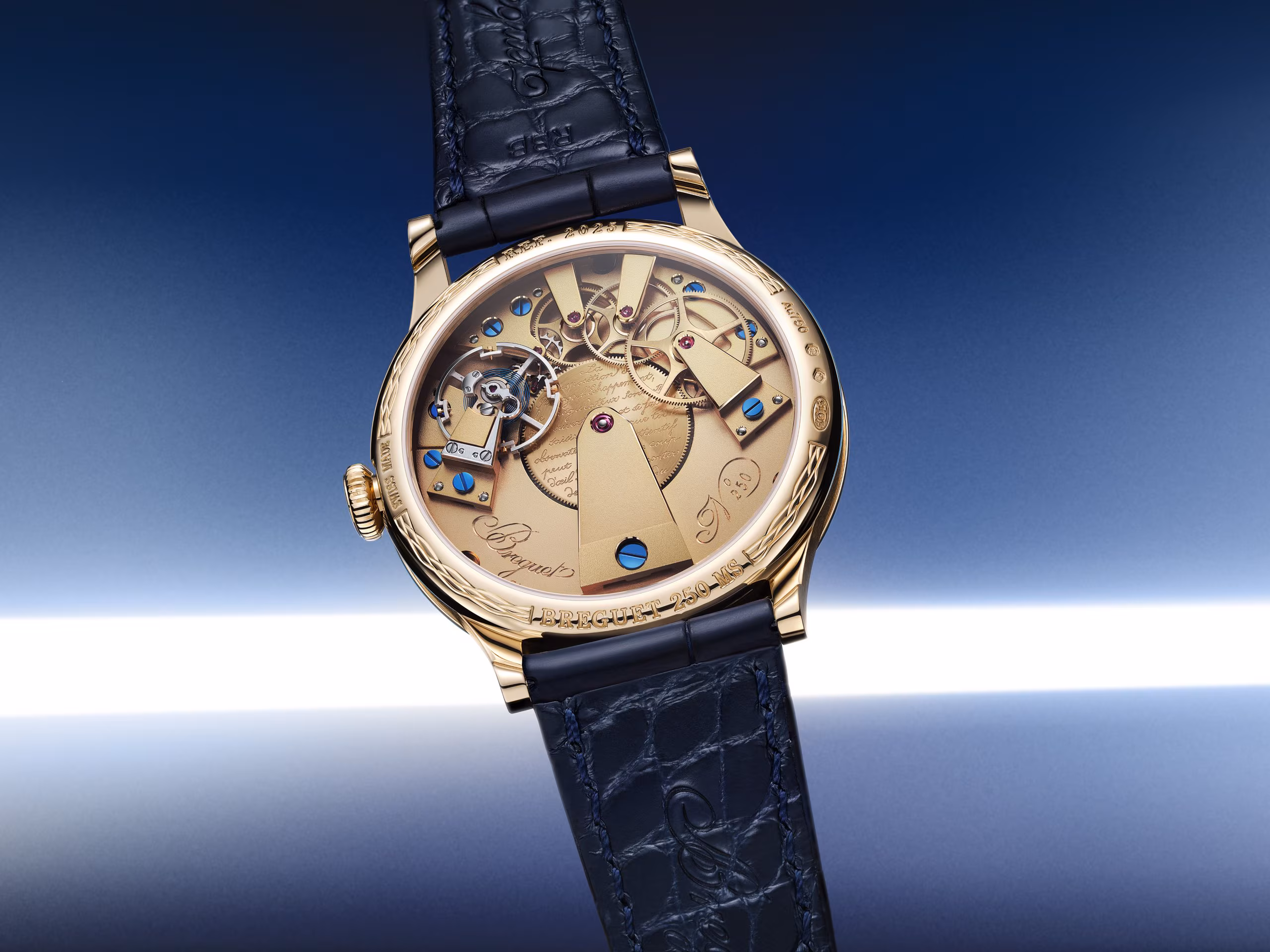 The case back is decorated with hand guilloché and also has a domed sapphire crystal. There is a commemorative engraving of “BREGUET 250 YEARS” on the bottom, and “REF. 2025” at the top.