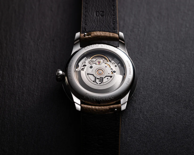 Through the open case back can be seen the automatic Sellita SW266-1A which beats at 28,800 VPH and has a power reserve of 38 hours. The Louis Erard logo is in black lacquer on the rotor.