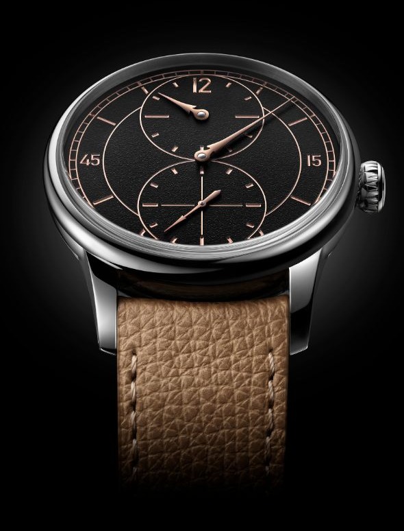 The new Gravé Noir comes in a polished stainless steel 39mm-sized case with water resistance of 50m and features an anthracite dial with fine-grained finishing and gold-plated engraved markings that have a galvanic finish. This latest regulator interpretation has a old-school sector dial influence, along with a railway track. The markers are polished 5N rose gold, as are the Erard fir tree hands.